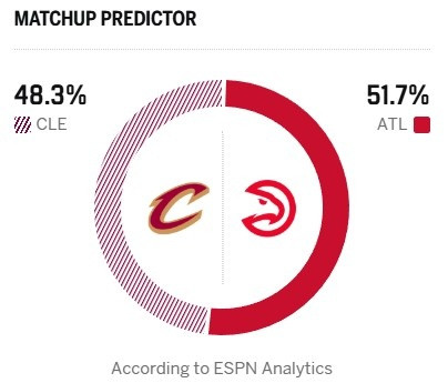 ESPN今日给出本场胜率预测,骑士为48.3%,老鹰51.7%占优。