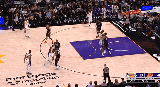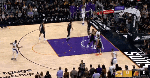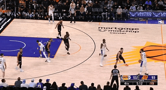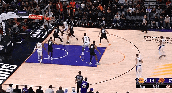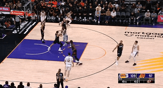 艾顿本场前板积极性拉满,单场6记前场篮板创下了湖人生涯新高。比如这个回合,篮下和狄龙肉搏卡位抢到前板后遭遇双人夹击,甩给外线斯玛特解套吸引太阳底线三人同时上提,艾顿顺势切入篮下并示意斯玛特送出空接。