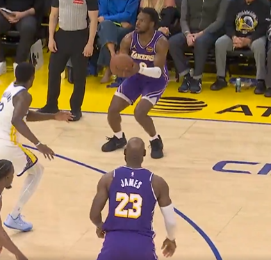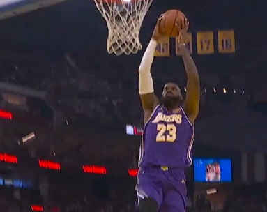 第三节比赛中,詹姆斯助攻布朗尼投进三分,湖人领先勇士至15分。
