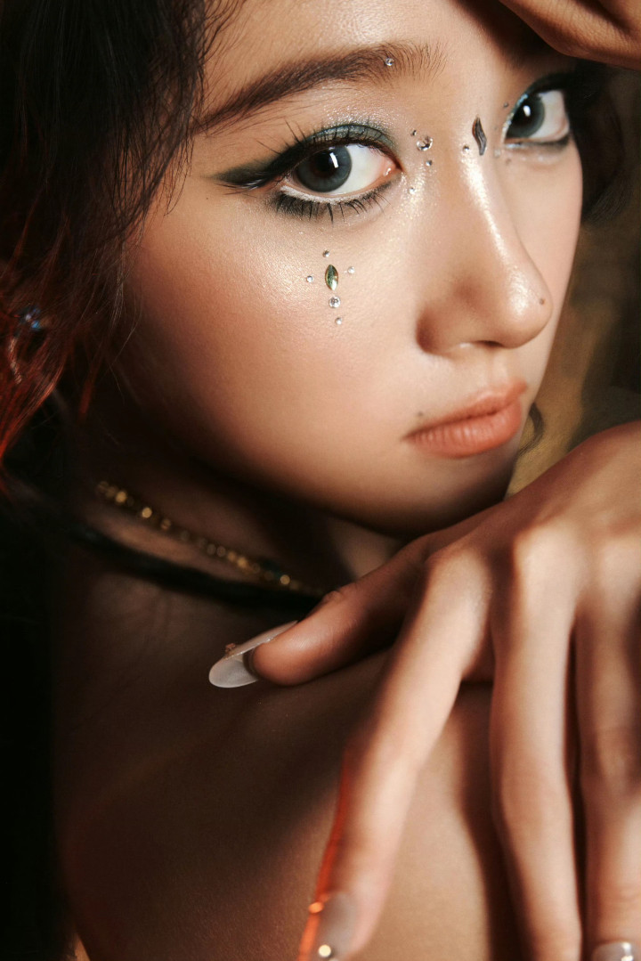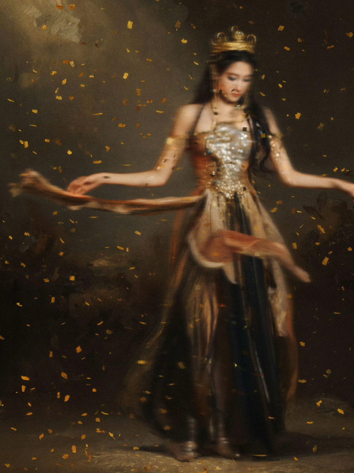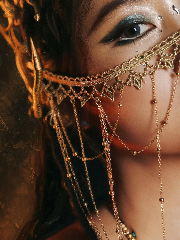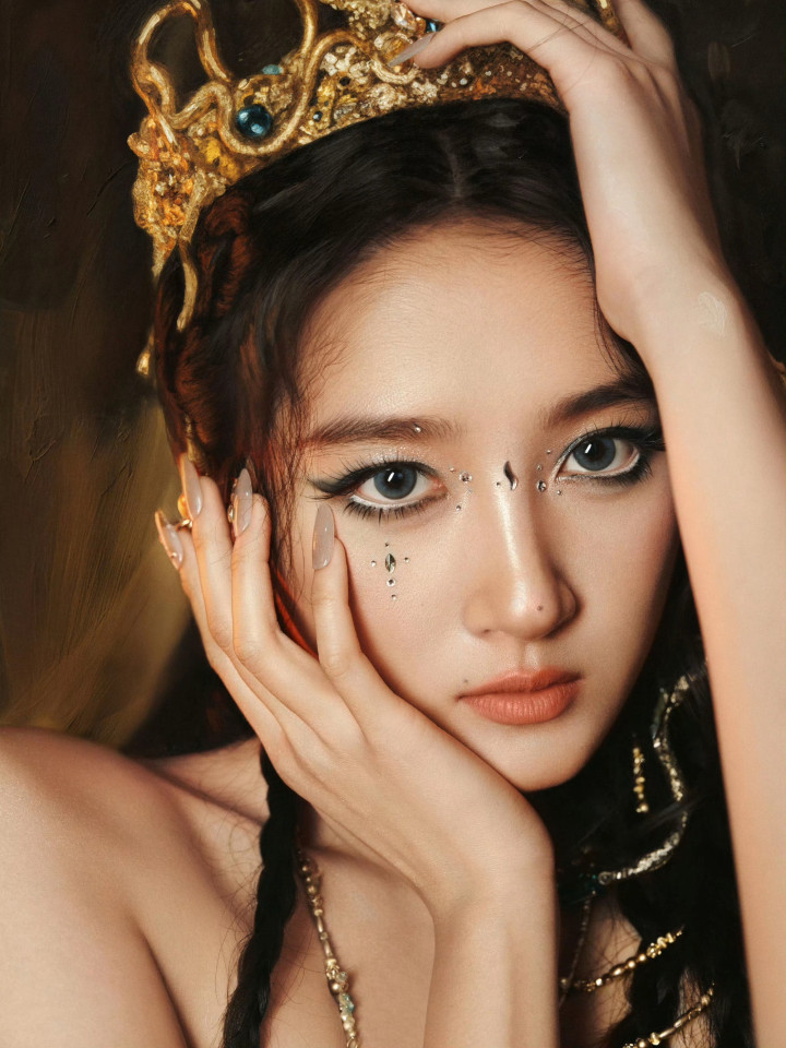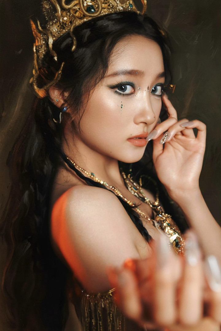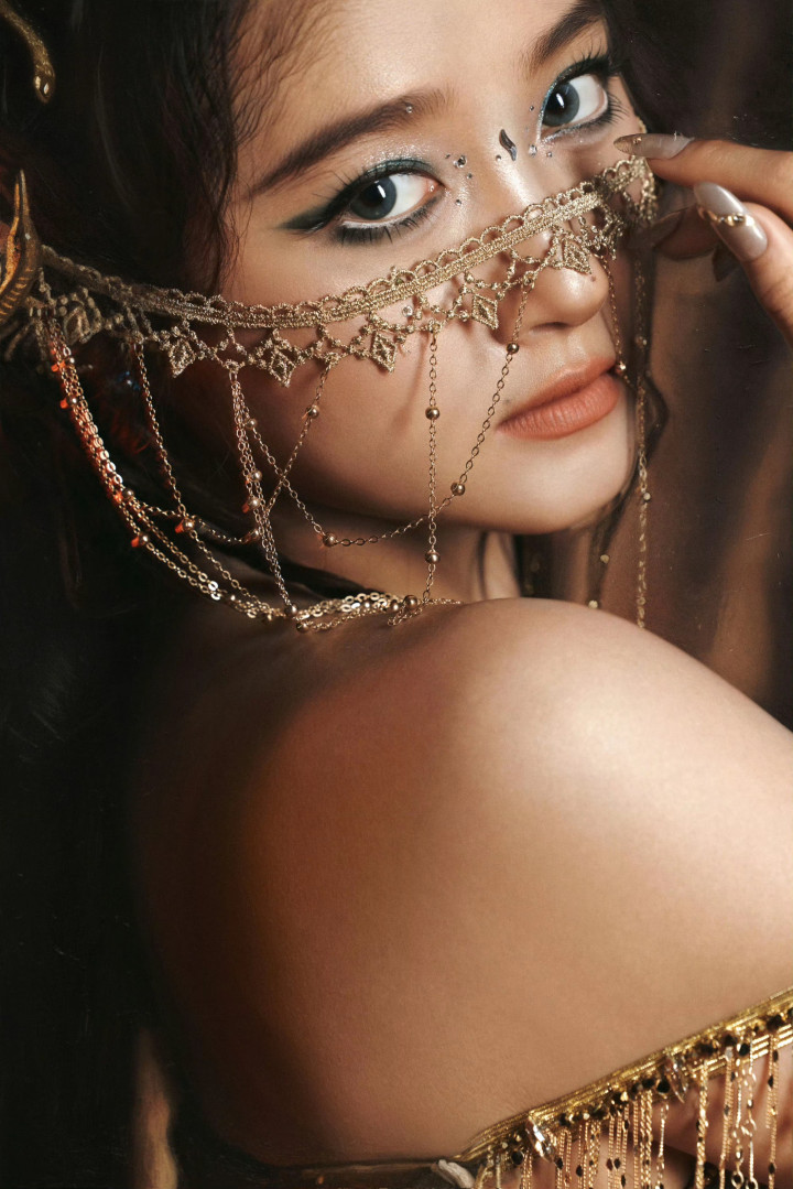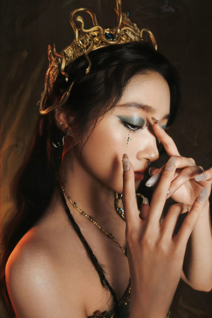 关晓彤异瞳少女戴流苏面帘身穿蓝金纱裙缓缓走来