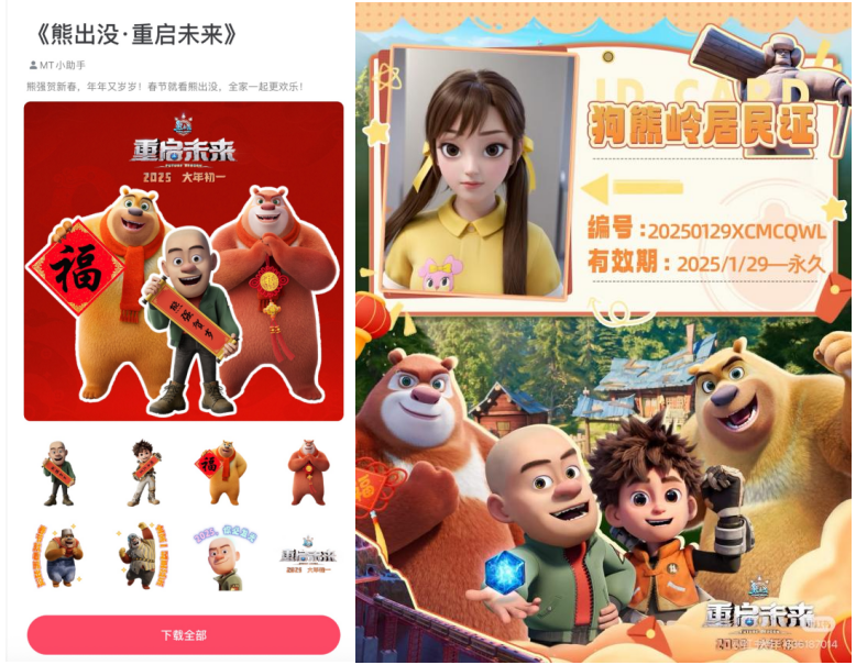 美图秀秀与《熊出没·重启未来》的合作,深度融合了电影角色形象与节日氛围,将传统“福”字、贺岁元素与熊大、熊二、光头强等经典动画角色结合,为大批用户的照片注入童趣与年味,极具创新的AI互动形式更是提升了用户与电影角色的文化融合。