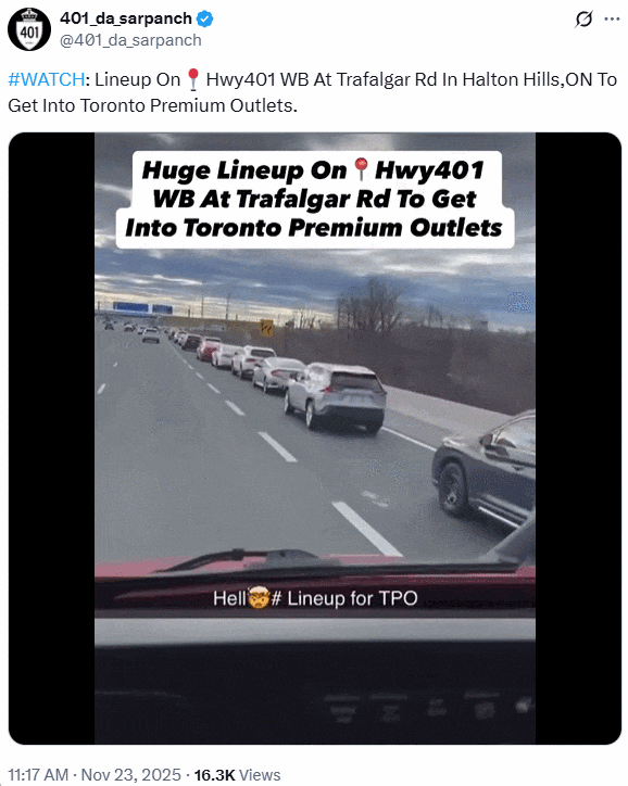 这条视频,已经在社交媒体X上疯传。11月23日周日,专注多伦多交通热门事件的博主@401_da_sarpanch称,在Halton Hills的401高速西向的Trafalgar Rd路口,排着一条超长的车队,只为进入多伦多Premium Outlets。